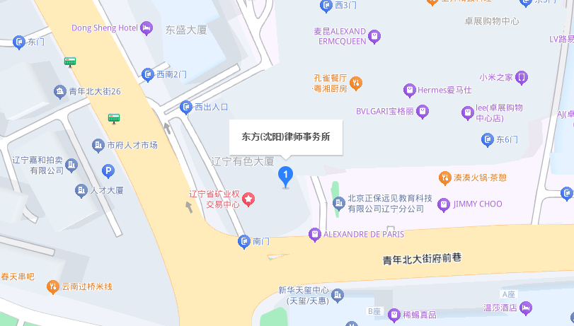 地图导航搜索东方(沈阳)律师事务所,停车场可选择卓展购物中心西侧入口或国测黄金大厦北侧入口进入,停至汇宝国际停车场。